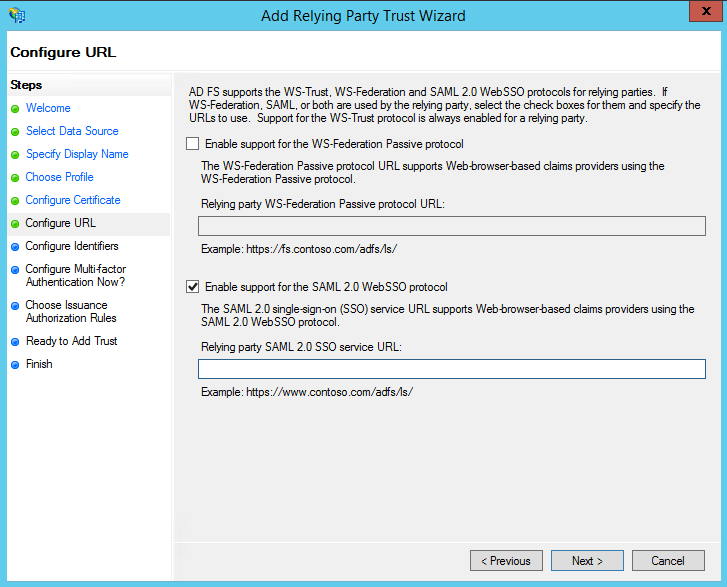 . O URL do serviço será https://Subdominio.Dominio.com.br/adfs/ls/, incluindo o subdomínio e domínio.